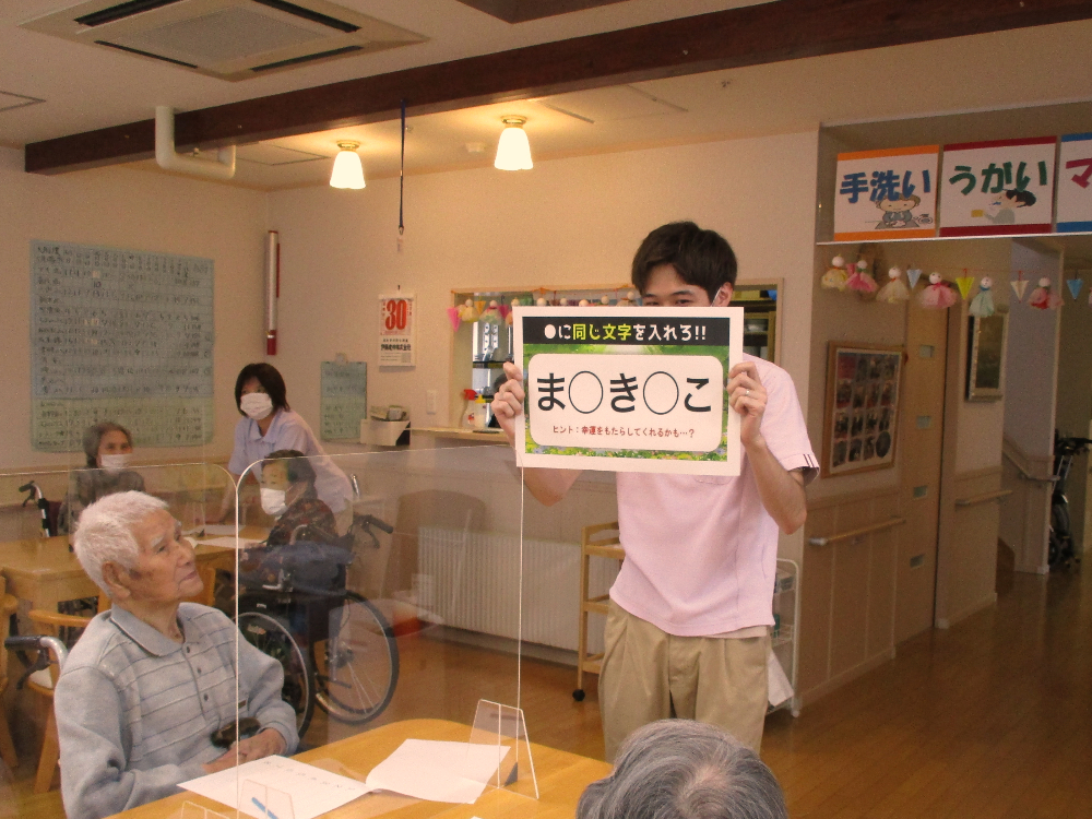 新着情報 NEWS ★楽しく頭の体操を★ 【パークサイドきらら】 2021.06.08 ブログをご覧の皆様、こんにちは!(^^)! 6月突入しましたね! 今年も早いもので半年が('Д') 今月も皆さまで楽しめるレクを行いましたっ 程よく頭の体操ができるゲーム、、、題して、、、『虫食いクイズ』 聞いただけでなんとなーく内容が想像できる名前です(/・ω・)/ ご想像の通り、言葉を使った穴埋めゲームです(/ω\) ブログをご覧の皆様はパッと正解がわかりましたか(・・? なかなか出てこないのは私だけでしょうか……??? 同じ文字というのがまた難しい。。。 ヒントをもとに、、、答えを探っていきます!! かなり難易度が高い問題ですが、正解できました!(^^)! 考えて、考えて正解するとスッキリしますね☆彡 問題は続々と続き今回は計8問の問題でした(^O^) 虫食いゲームは初めて計画したレクでしたが 程よく頭を使い楽しめるレクでした(^^♪ 次回も楽しめるレクを計画しようと思います! PS.玄関先のお花がきれいに咲いていました(^_-)-☆今後も観察していきたいと思います! パークサイドきらら 早川 一覧に戻る