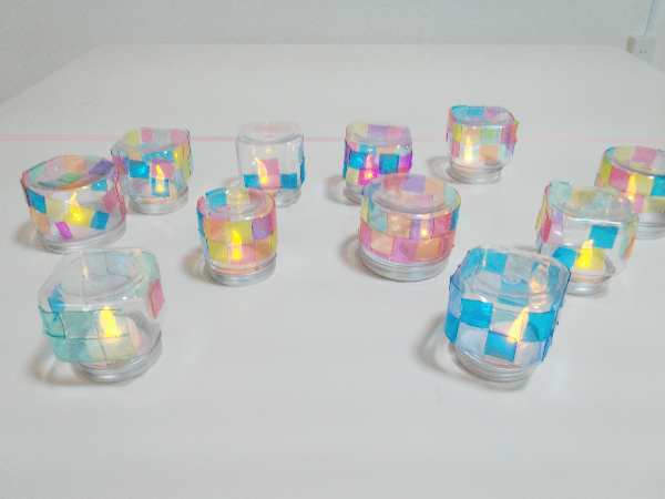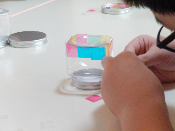 色を付けた透明両面テープを四角にカットして容器にペタペタ貼ります。